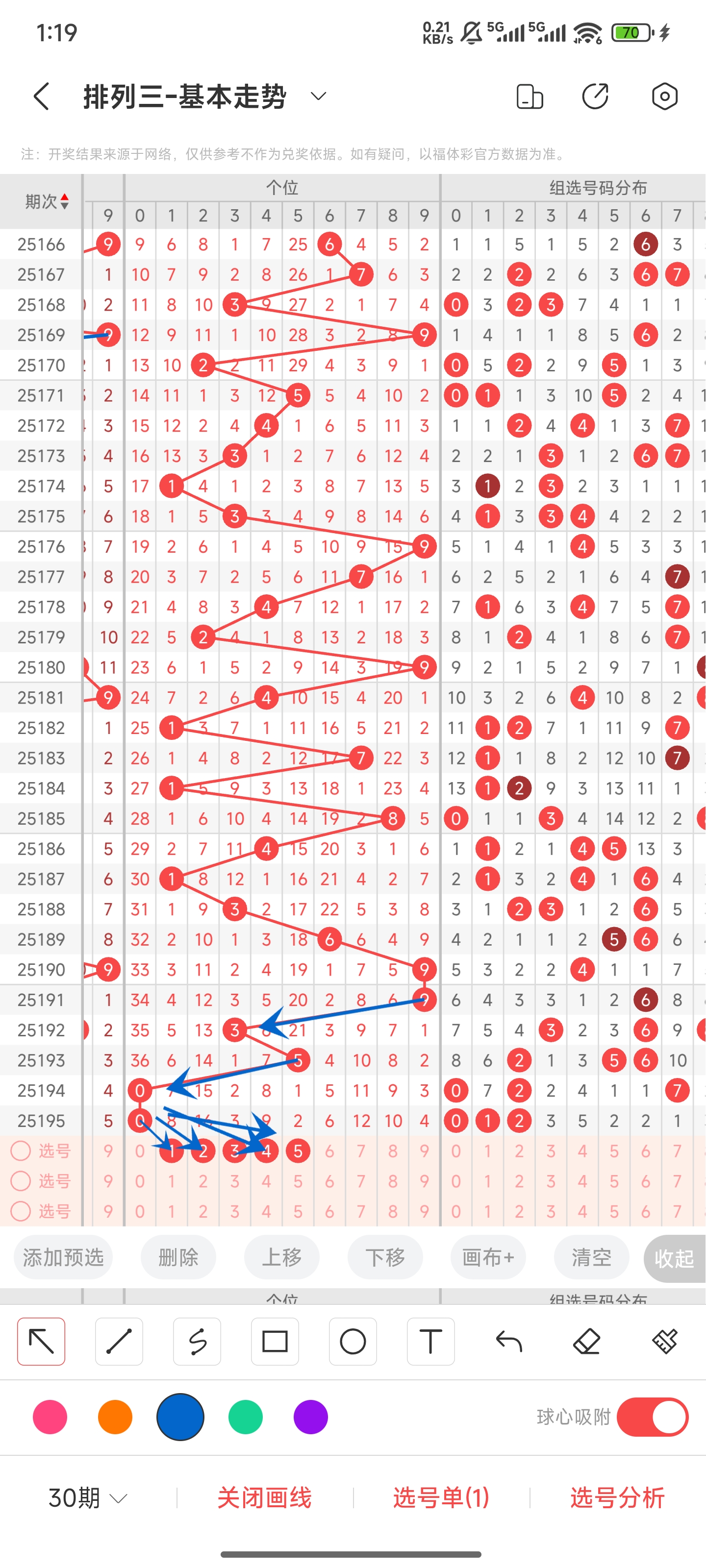 先回顾一下上期情况,开出210,和尾为3,跨度为2,奇偶比为1:2,大小比为0:3,012路个数对比为1:1:1。