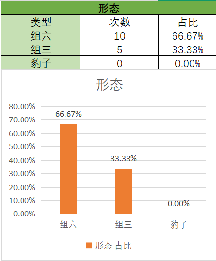 上期是组六类型,纵观最近15期形态,组六还是最热门的,开了10期,其次是组三,开了5期。所以本期还是优先考虑组六,防组三。