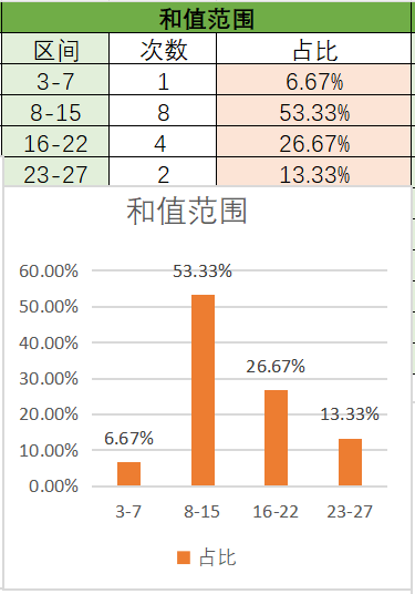上期和值为17,处在16~22之间,纵观最近15期开出的号码,最热门是8~15,次之是16~22,然后是23~27,最后是3~7。上期和值为17,本期看好和值变小,看好开在8~15之间,其次是16~22。