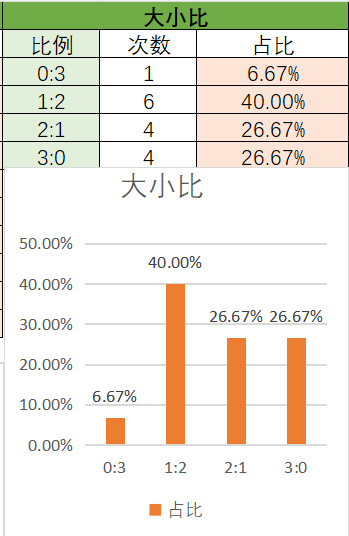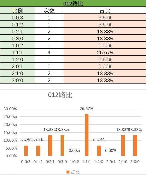 上期开了3:0。纵观这15期,目前最热门的是1:2,2:1,最后是3:0。本期看好2:1,其次是1:2。