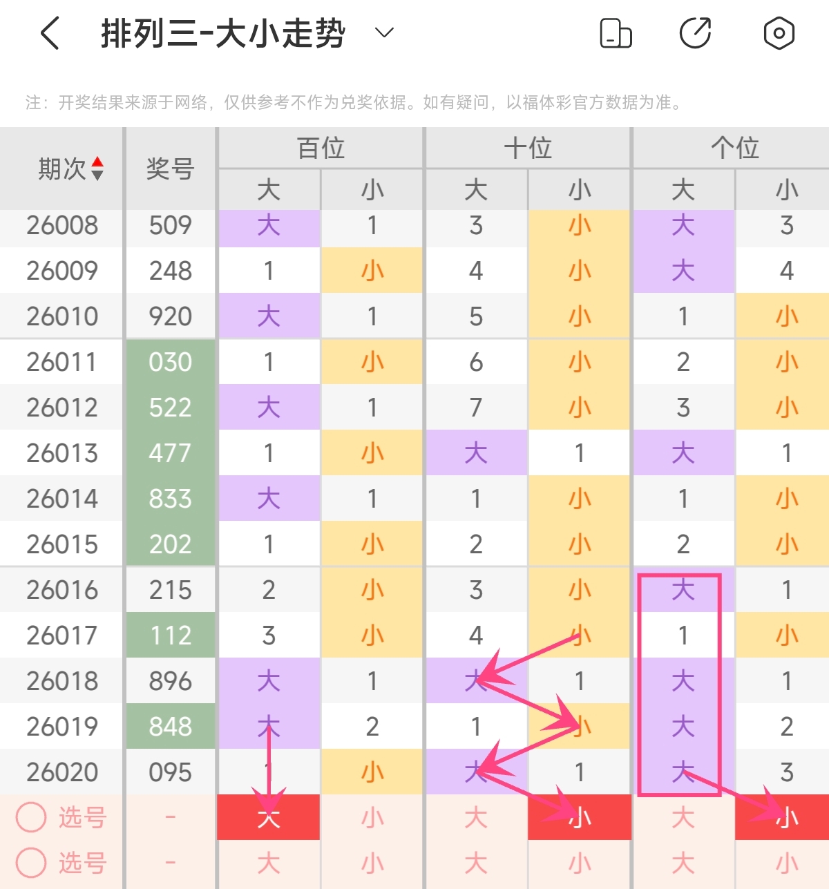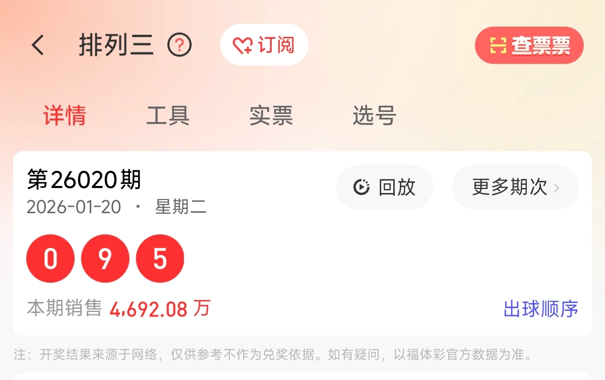 首先让我们回顾一下上期排列三第2026020期开奖号码为095,为组六形态,大小比为2:1,奇偶比为2:1,跨度为9,和值为14。
