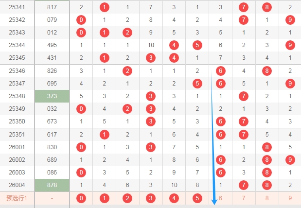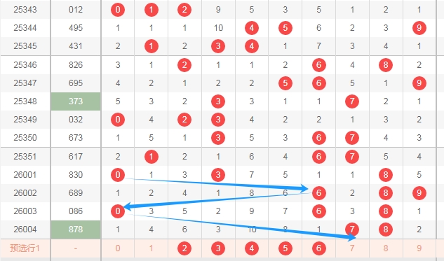 上图是体彩排列三开奖号码分布走势图,我在上面走势图中标出来的数字2 3 4 5 6是因为你们看我画出来的蓝色箭头可以发现最近三期开出的跨度都大,那么本期出小跨度的概率就大,个人觉得如果是小跨度的话,那么应该就是2 3 4 5 6这几个数字的位置。