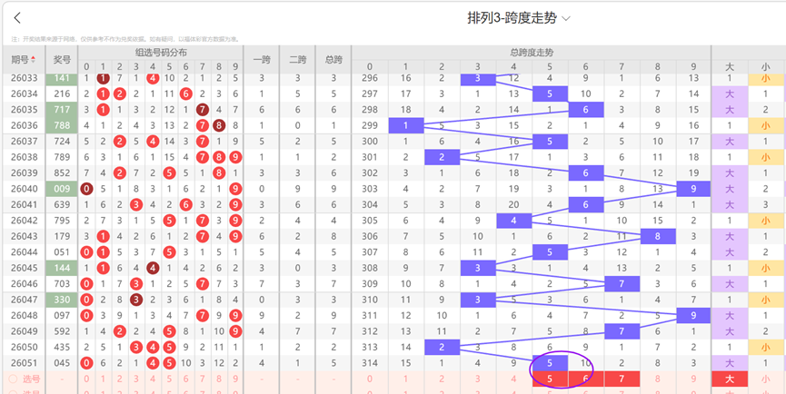 通过观察跨度及跨度属性走势可以发现:近10期内跨度较少开出01等号码,本期跨度大概率仍然不会开出01等号码,因此本期跨度选号时可以优先排除01等号码,再结合上述走势图看,本期跨度看好567等号码。