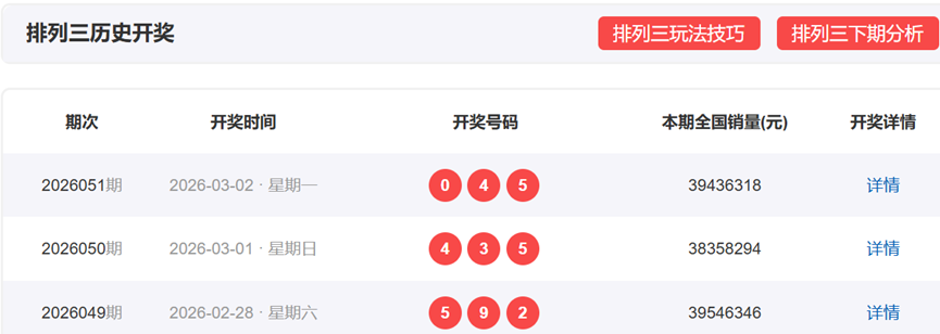 体彩排列3上一期,开奖号码为045,形态为组六,奇偶比为1:2,012路数值表现为012,和值09,和尾9,跨度5。