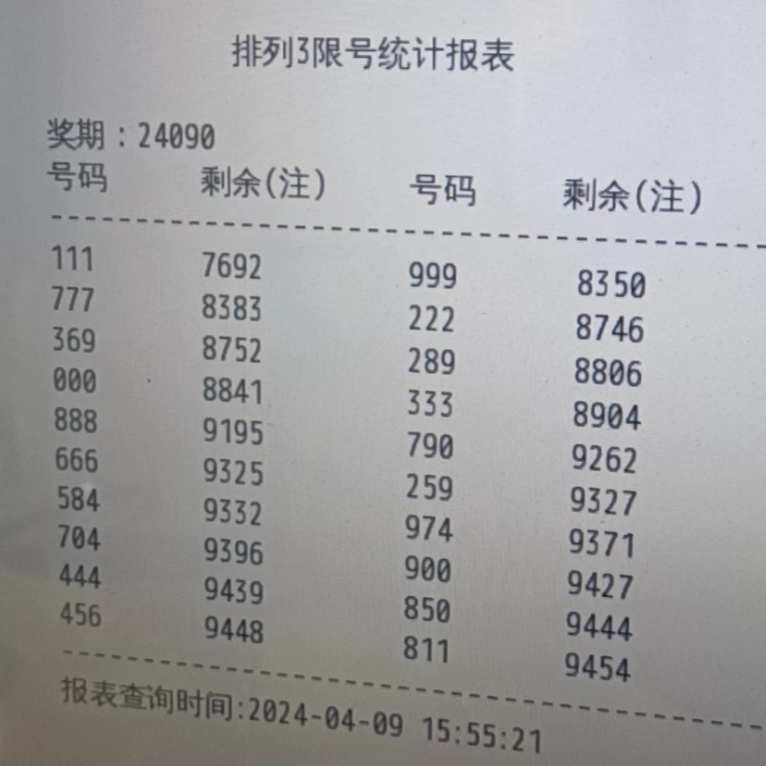 一、2024090期 排列3限号统计报表