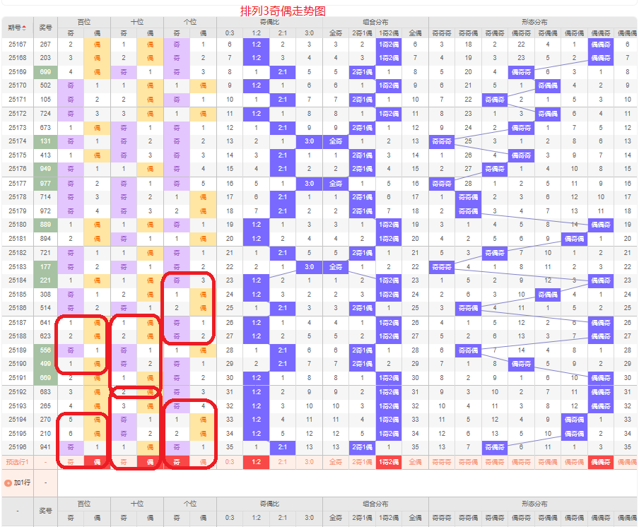 上一期的奇偶比为2:1,两奇的号码组合,从近五期的奇偶数出现情况看,奇数出6次,偶数出现9次,奇数号码出现较少,本期要侧重两偶的号码组合,侧重偶偶奇或偶奇奇的号码组合,根据奇偶组合形态可做五码定位024689/024689/13579或024689/13579/13579