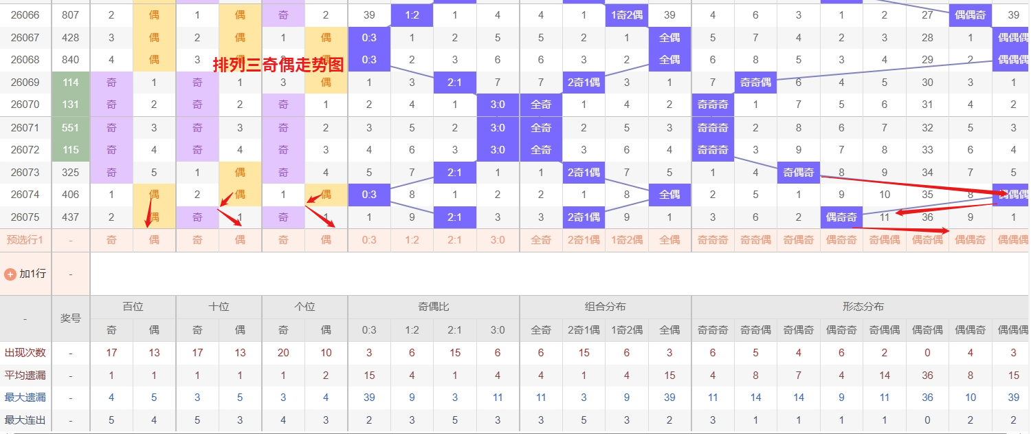 排列三 奇偶分析:从上图可以看出排列三100期内百位奇偶比约为49比51,十位奇偶比为54比46,个位奇偶比为53比47,百位的比值比较均衡,但是十位的比值偏差就有点大,历史奇偶形态近2期开出偶奇奇后下一期的走势为,第345期开出偶奇奇后346期开偶偶奇, 第004期开出偶奇奇后第005期开偶奇偶,第022期开出偶奇奇后第023期开奇奇偶,近期排列三奇偶走势来看,偶偶奇作为当前阶段的热号形态,出号频率显著偏高,走势连贯且热度稳固,按照热号恒热的惯性规律,短期内仍有较大概率继续连下,需重点跟进;而偶奇偶则已遗漏多期,冷态积累充分,从冷热均衡的角度分析,长期未出的形态往往存在较强的回补需求,随着遗漏值的持续放大,其反弹的动能也在不断积聚,近期同样值得留意。热号连下可期,冷号回补在即,所以排列三2026076期奇偶形态推偶偶奇与偶奇偶。