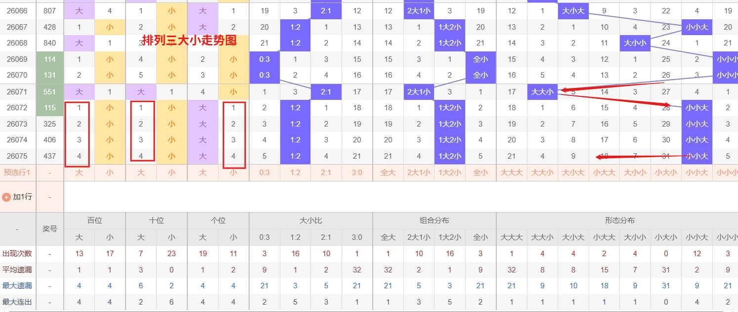 排列三 大小形态分析:从大小走势图上可以看出排列三100期内百位大小比约为47比53,十位大小比约为49:51,个位大小比约为55比45,除了个位奇数比偶数多,十位和百位偶数比奇数多。历史数据近2期开出小小大下一期的走势为,第337期开小小大后第338期开大小小。第007期开出小小大后第008期开小大小,第022期开出小小大后023期开小大大。近期排列三大小走势来看,大小小作为当前阶段的热号形态,出号节奏紧凑、活跃度持续走高,热势一旦形成往往具备较强的惯性,短期内仍有较大概率延续连下的态势,值得重点跟进;而小大小则已遗漏多期,冷态积累充分,从冷热均衡的角度出发,长期未出的形态本身就积聚了较强的回补动能,随着遗漏值的不断放大,其反弹的预期也愈发明确,近期同样需要多加留意。热号连下可期,冷号回补在即,所以排列三第2026076期大小形态推荐大小小小大小