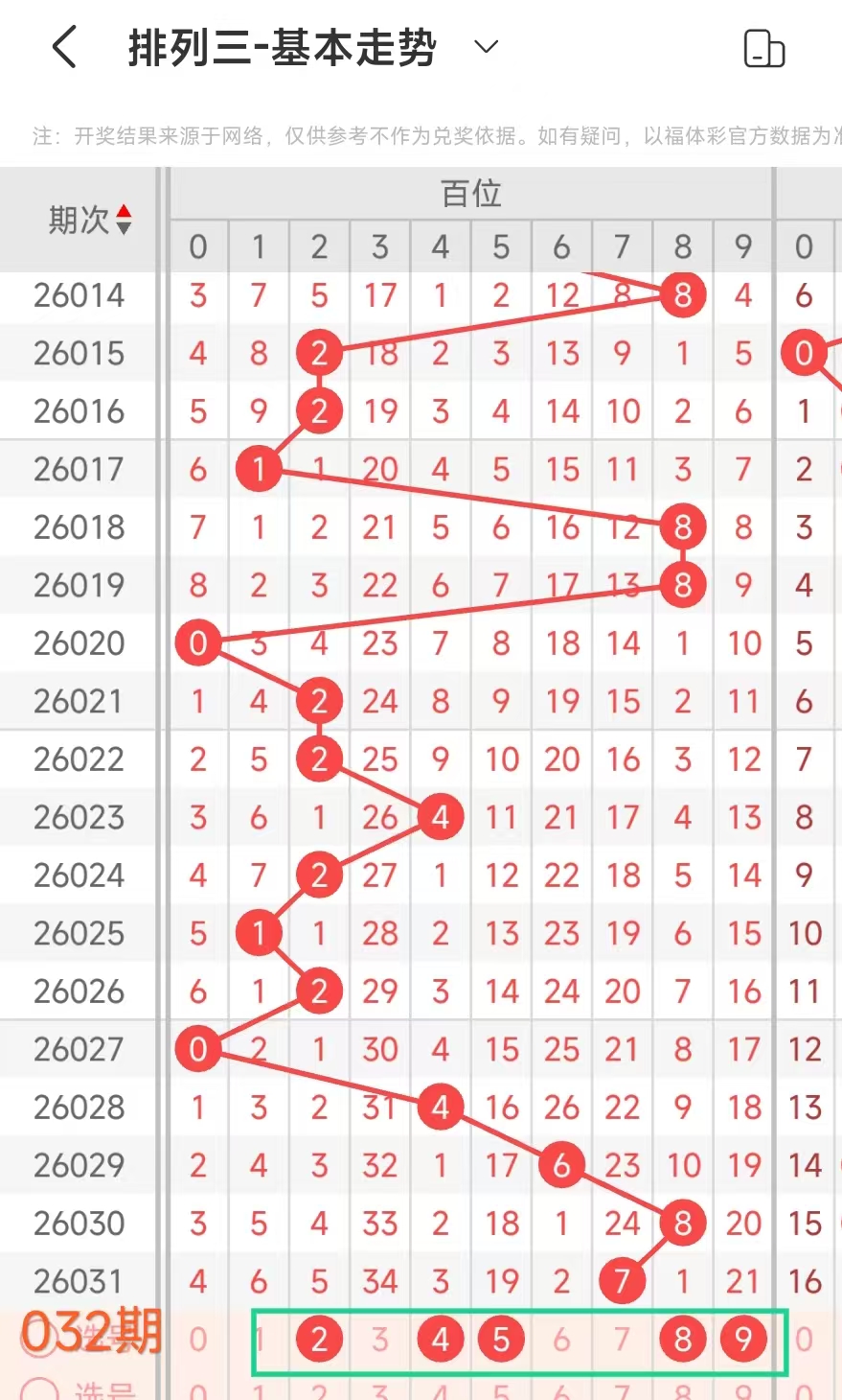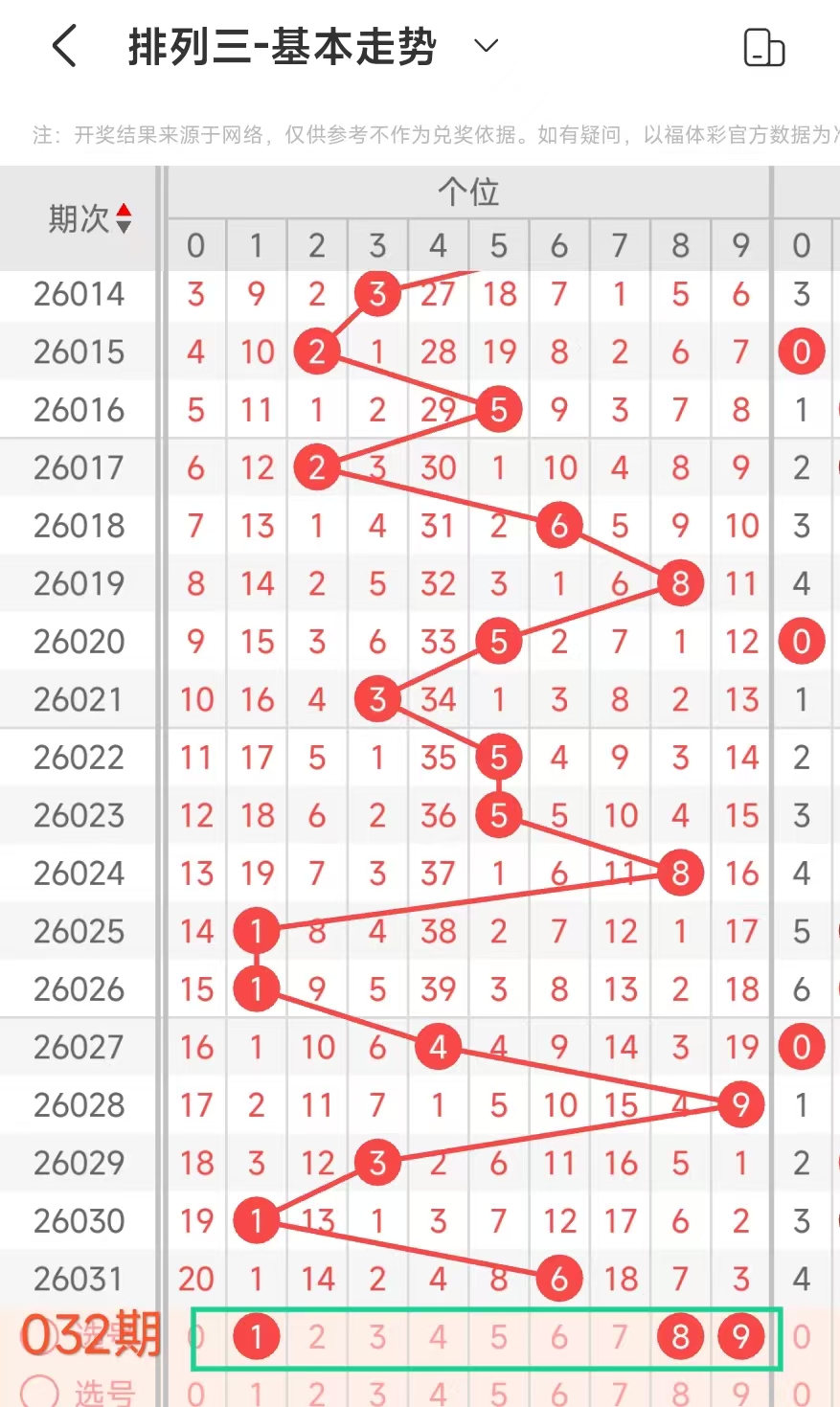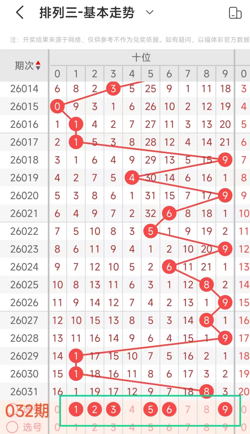 经统计0号出现6次、1号出现4次、2号出现3次、3号出现10次、4号出现3次、5号出3次、6号出现6次、7号出5次、8号出现8次、9号出现8次.统计后出现次数靠前的数字作为我们的备选号码.其号码有36789等
