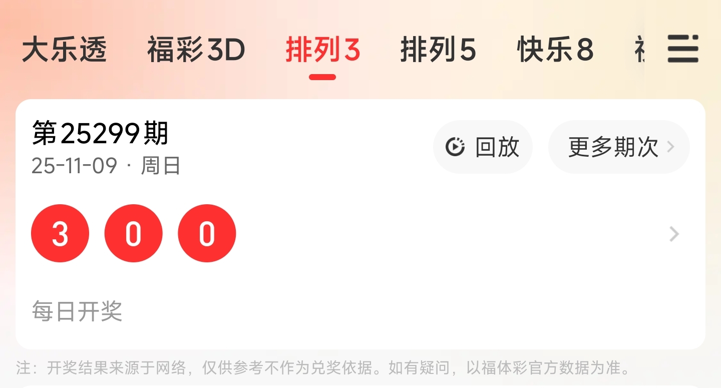 上期开出300,和尾为3,跨度为3,奇偶比为1:2,大小比为0:3,012路个数对比为3:0:0。