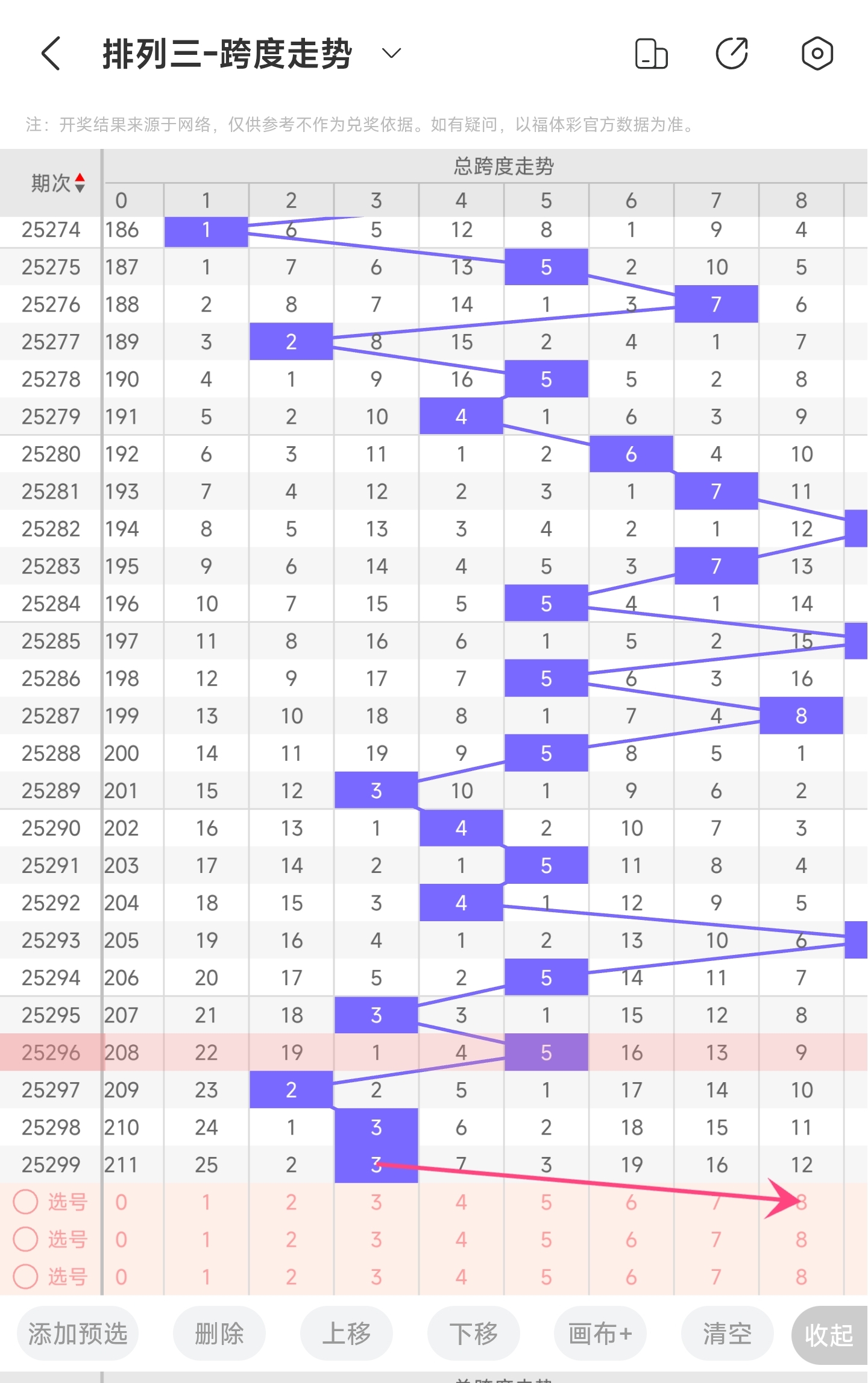 上期跨度为3,往前一期跨度是3,趋势没有移动,偏移量为0。跨度值3时,跨度值是近30期内开出的比较小的值。通过走势图分析,目前的趋势是大概率往右。所以推测本期跨度可能为45678等跨度。