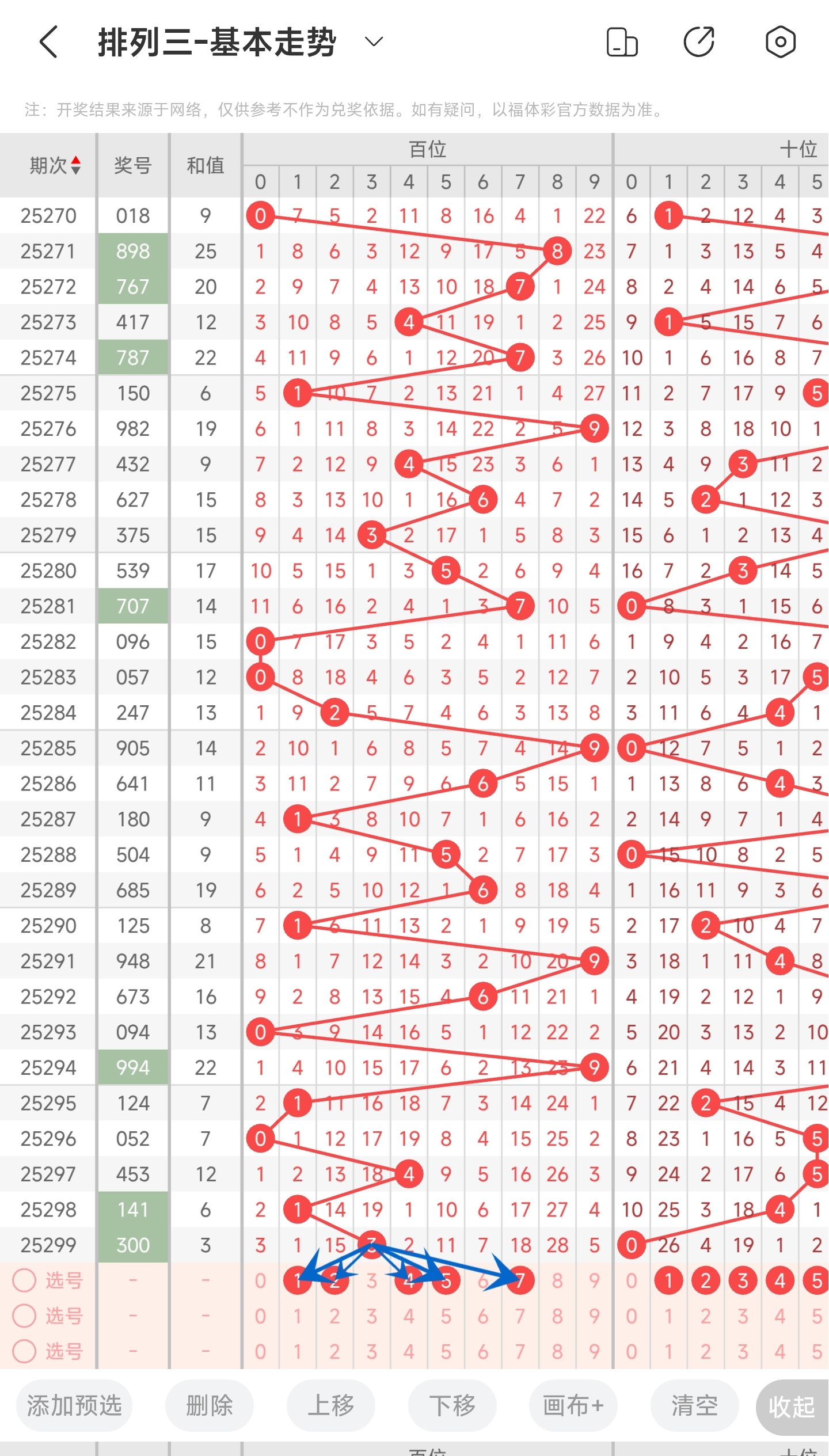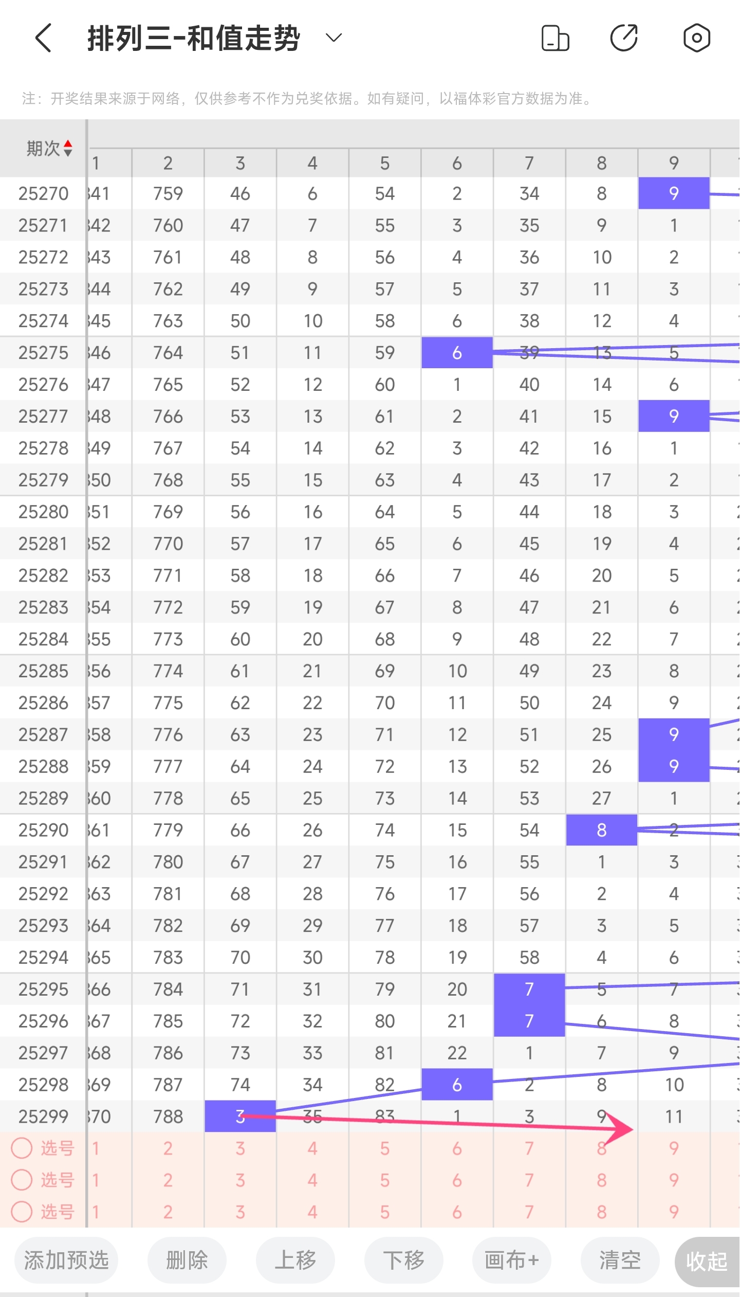 上期和值为3,往前一期和值为6,趋势往左移动,偏移量为3。通过走势图分析,3和值是近30期内开出的最小的和值,下降的空间已经非常小,上升的空间很大。所以推测趋势是大概率往右,极小概率往左。本期看好大和值,因此推测本期趋势是往右的,和值会变大,极小概率继续往左,和值变小。