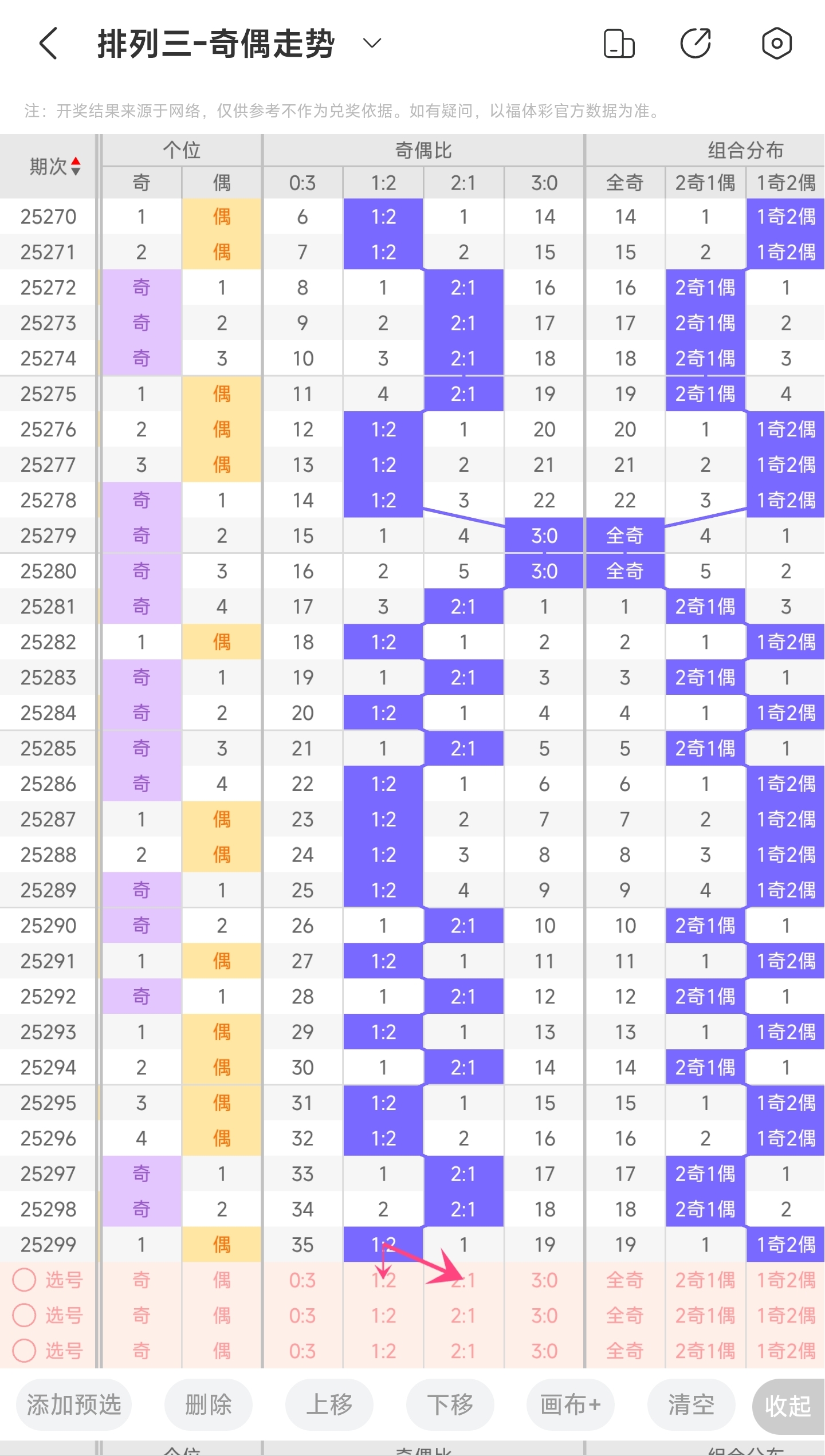 上期开出了1:2的奇偶比。往前一期是2:1奇偶比。通过分析奇偶走势图,近30期内开出1:2奇偶比的次数是16次,开出2:1奇偶比的次数是12次,3:0是2次,0:3是0次。1:2奇偶比次数变多,2:1奇偶比次数变少。通过走势图分析,可以就看到1:2奇偶比和2:1奇偶比已经很接近了,本期2:1奇偶比可能会回补。所以推测本期可能开2:1奇偶比,其次是1:2奇偶比,最后是3:0或者0:3奇偶比。