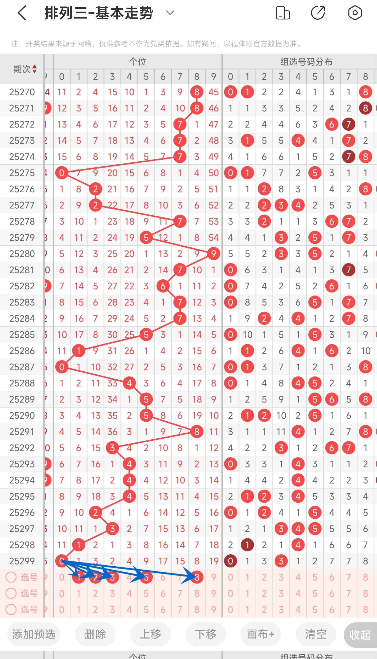上期开出的是0号,往前一期是1号。趋势往左移动,偏移量是1。通过走势图分析,可以看到目前趋势是比较明显往右的了。最近很长的一段是内,开的都是小偏移量的号码,本期我们继续关注小偏移量的号码,但要防中大偏移量的号码回补。最后再结合遗漏期数和冷热号,我们可以关注1,2,3,5,8等号。综上所述本期推测可能开出1,2,3,5,8等数。