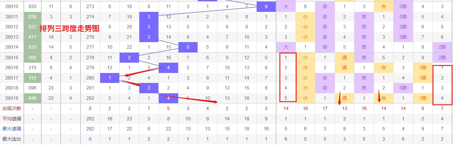 排列三 跨度分析:从上图可以看出近100期的跨度大小比约为53比47,跨度奇偶比约为46比54总体来看还是比较均衡的,但跨度大小之间有点差异。我们再从历史开出4跨后下一期6跨度数据来做参考。最近10期跨度大小比约为4:6期开出大数跨度过多返回小数跨度的概率更高一点。历史开奖近2期出4跨以后的走势为291期开出4跨后下一期走5跨走出1振幅,第306期开出4跨后下一期走6跨走2振幅第323期开出4跨后下一期开出7跨走出3振幅。连续多期小振幅,近期排列三跨度走势分析,6跨持续保持活跃状态,已成为当前明显的热号跨度。其短期内反复开出的现象表明,该跨度正处于强势周期内,能量尚未完全释放,后续仍有较大概率实现连开,值得作为近期重点关注与追踪的对象。与此同时,7跨则已遗漏较长周期,逐渐步入冷号区间。根据跨度冷热交替与平衡回归的规律,当某一跨度过度沉寂后,其回补的动能也会随之积聚。出4跨度后容易走出1到4个跨度振幅的对称形态,跨度走出1到4个振幅看好的跨度有3567跨,所以第2026020期排列三跨度推荐3567跨。