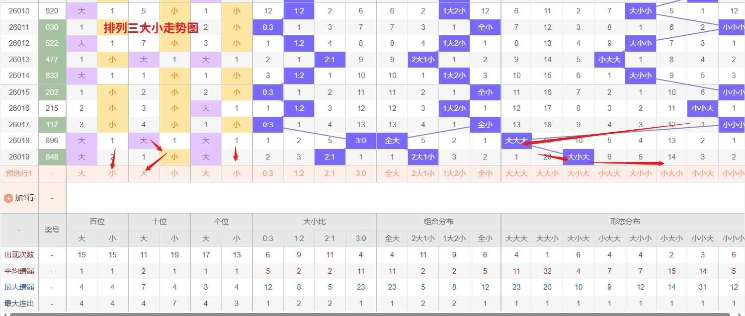排列三 大小形态分析:从大小走势图上可以看出排列三100期内百位大小比约为54比46,十位大小比约为47:53,个位大小比约为51比49,除了个位和百位奇数比偶数多,十位偶数比奇数多。历史数据近2期开出大小大下一期的走势为,第294期开出大小大第295期开小大大。第304期开出大小大后第305期开大大小,第312期开出大小大后313期开小大小。近期排列三大小形态走势来看,“大大小”已持续遗漏较长时间,处于明显冷态。根据形态分布的平衡特性,冷态组合往往在积累一定周期后存在较强的技术性回补需求,接下来需重点关注其解冻的可能。与此同时,“小小大”目前处于温号区间,近期出现频率有所回升,呈现一定的转热迹象,所以排列三第2026020期大小形态推荐小大大防大大小。