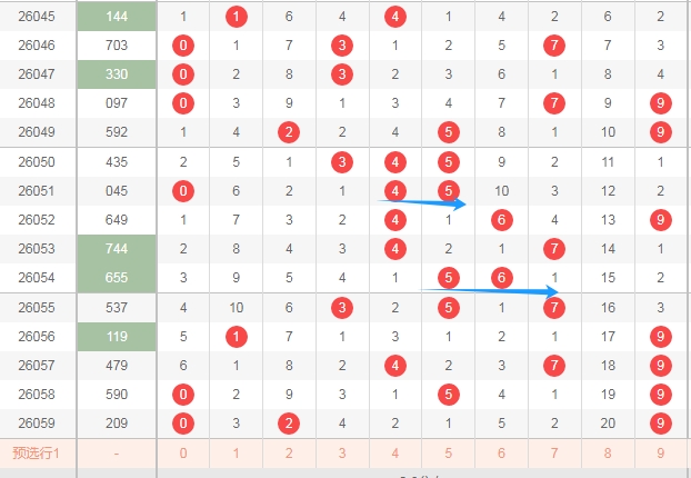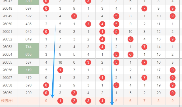 上图是体彩排列三开奖号码走势分布图,我在上面走势图中标注出来的蓝色箭头中间这个区域的数字1234最近两期只出现了一个数字,最近几期这个区域出号码也不多,那么本期这个区域的数字1234可以关注出一个或者两个。