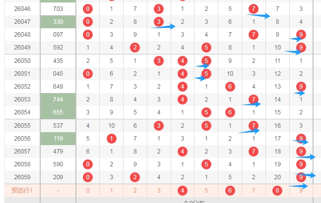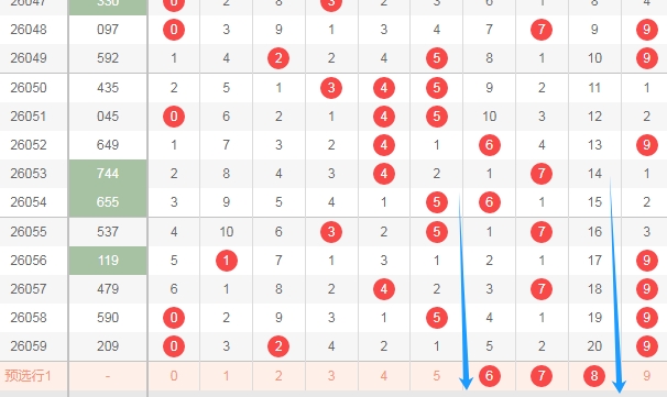 上图是体彩排列三开奖号码走势分布图,我在上面走势图中标注出来的蓝色箭头中间这个区域的数字678最近四期只出现了一个数字,最近几期这个区域出号码也不多,那么本期这个区域的数字678可以关注出一个或者两个。