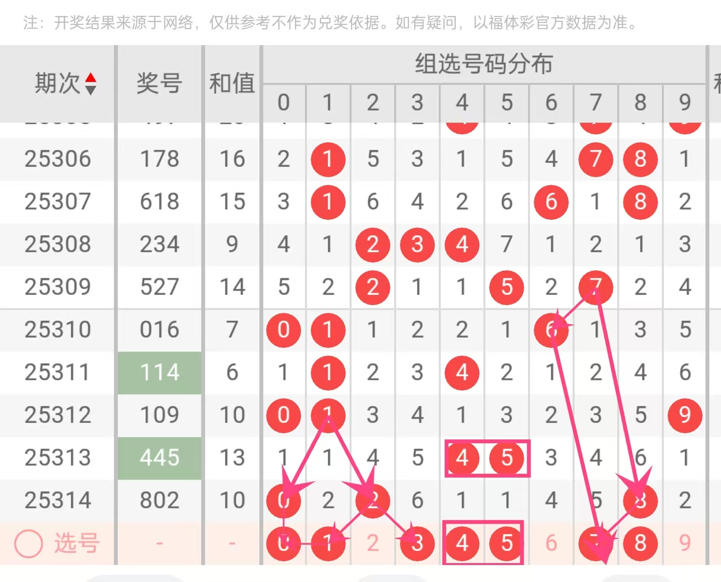 理由:数字0在近5期出现3次,是热号,尤其在十位和百位活跃(如期号2025310、2025312、2025314),下期可能继续出现。从奇偶分布看,数字0是偶数,近5期偶数较多,但热号延续优先于平衡。大小比上,数字0是小号,近期小号主导,其出现符合模式。质合比中,数字0是合数,合数出现频繁,但数字0作为边界数字,常在和值低时出现(如近期和值6、7)。跨度序列(8、1、9、3、6)显示跨度波动大,数字0能导致跨度变化。因此,数字0基于热号和位置走势,是一个高概率胆码。