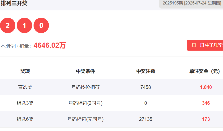 今天是2025年7月25,是排列3游戏第196期开奖,那么上一期第195期排列3开奖,210开了一个012的一个顺子
