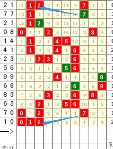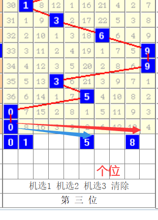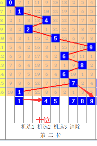 现在我们还是看一下十位的一个情况,上一期开了一个6跨度的1,那么本期的话还是要防一下这个1要重复。假设一不重复啊,我们往右运动的话啊,大跨度我们关注789啊,小跨度我们关注45。所以说这个十位的话就有。这几个号145789啊,供大家参考