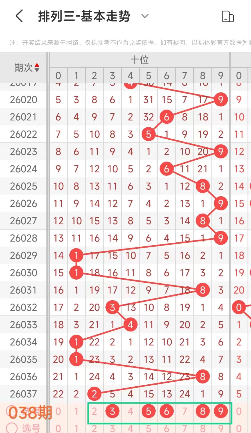 经统计0号出现5次、1号出现4次、2号出现9次、3号出现10次、4号出现5次、5号出6次、6号出现6次、7号出3次、8号出现5次、9号出现10次.统计后出现次数靠前的数字作为我们的备选号码.其号码有2389等