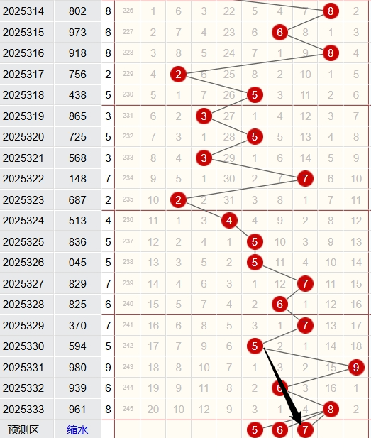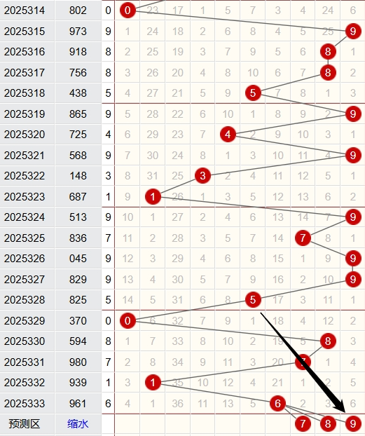 上期跨度为8,近5期跨度开出情况:第25329期开出7,属于奇数,1路号码,火属性;第25330期开出5,属于奇数,2路号码,土属性;第25331期开出9,属于奇数,0路号码,金属性;第25332期开出1,属于奇数,1路号码,水属性;第25333期开出8,属于偶数,2路号码,木属性;