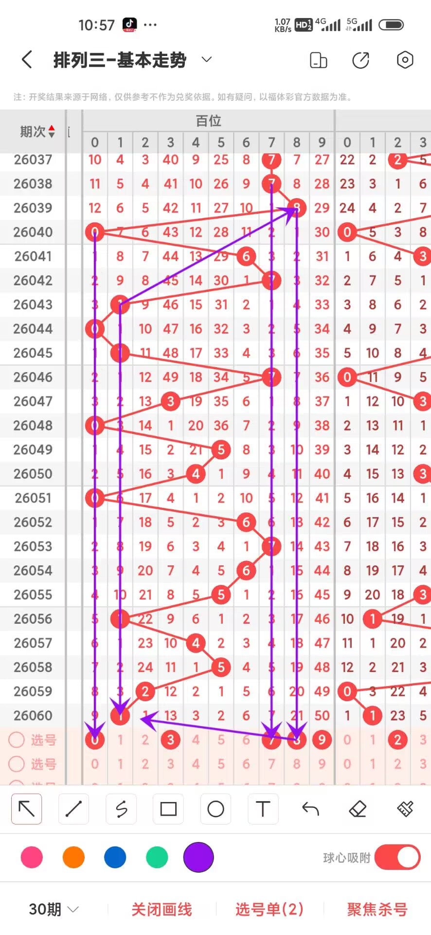 2026061期上期百位开出奇数1,我们通过走势图来看百位上500期,0-9下号数据和最大遗漏数据,其中0出现48次,1出现61次,2出现52次,3出现42,4出现45,5出现45,6出现51,7出现54,8出现59,9出现43,0-9目走1下号最多,我们在回过头来看最大遗漏下号,0遗漏55次,1遗漏45次,2遗漏31次,3遗漏49次,4遗漏31次,5遗漏52次,6遗漏26次,7遗漏36次,8遗漏33次,9遗漏50次,目前遗漏中095遗漏最大,通过上面的走势分析,我们可以看出目前百位上走势比较好的号码是小号,我们可以关注下,893号码走势就有点冷淡,我们可以防守,今天百位我们重点关注23789,具体看下面走势图