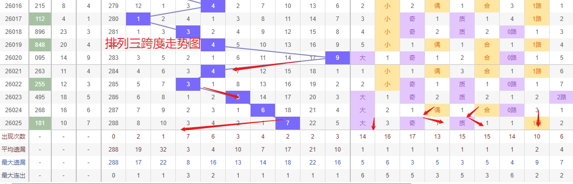 排列三 跨度分析:从上图可以看出近100期的跨度大小比约为52比48,跨度奇偶比约为46比54总体来看还是比较均衡的,但跨度大小之间有点差异。我们再从历史开出7跨后下一期2跨度数据来做参考。最近10期跨度大小比约为4:6期开出小数跨度过多返回大数跨度的概率更高一点。历史开奖近2期出7跨以后的走势为302期开出7跨后下一期走2跨走出5振幅,第314期开出7跨后下一期走5跨走2振幅第328期开出7跨后下一期开出6跨走出1振幅。连续多期大振幅,排列三近期的跨度走势分析,跨度6表现持续活跃,已形成明确的热态趋势,其走势强劲且形态支撑明显,短期内存在进一步连下的可能,值得重点跟踪。而跨度2目前处于明显的冷态区间,遗漏周期较长,但从跨度分布的平衡特性来看,冷跨往往在积累一定遗漏后存在较强的回补压力,尤其在热跨持续发力后,需警惕号码轮动带来的转折机会,因此对冷跨2的防守同样不可忽视。在关注热跨6延续的同时,适当防范冷跨2的突袭,出7跨度后容易走出1到5个跨度振幅的对称形态,跨度走出1到5个振幅看好的跨度有2568跨,所以第2026025期排列三跨度推荐2568跨。本文由一起彩钱是生命动力所著,请勿转载