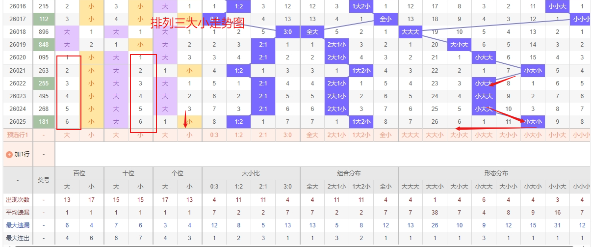 排列三 大小形态分析:从大小走势图上可以看出排列三100期内百位大小比约为52比48,十位大小比约为49:51,个位大小比约为54比46,除了个位和百位奇数比偶数多,十位偶数比奇数多。历史数据近2期开出小大小下一期的走势为,第302期开出小大小第303期开大小大。第315期开出小大小后第316期开大大小,第323期开出小大小后324期开小小大。排列三近期大小走势来看,“大小大”组合持续活跃,已形成明确的热态趋势,其形态稳固且出现频次较高,短期内仍有延续的可能性,值得作为当前关注的重点。而“大大小”组合则处于相对冷态,遗漏周期逐渐延长,但根据大小分布的历史平衡规律,冷态组合往往在经历一段低谷后存在较强的回补需求,尤其在热态组合持续走强之后,需警惕走势风格的突然切换。所以排列三第2026026期大小形态推荐大小大防大大小。本文由一起彩钱是生命动力所著,请勿转载