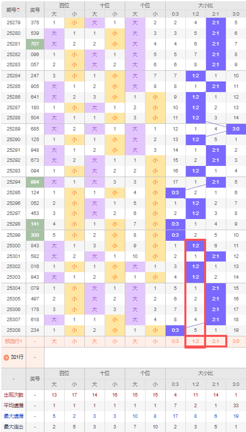 上期大小比:0:3,近10期大小比出现情况:0:3、1:2、2:1、1:2、1:2、2:1、2:1、2:1、2:1、0:3,最近10期出5期2:1,出现3期1:2,出现2期0:3,出现0期3:0,根据近10期出号规律本期推荐遗漏5期的1:2,防隔期的2:1,综上所述大小比推荐:防:2:1,重点关注:1:2。