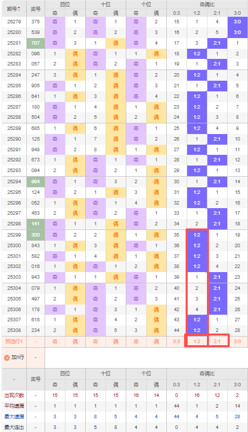 上期奇偶比:1:2,近10期奇偶比出现情况:1:2、1:2、1:2、1:2、2:1、2:1、2:1、2:1、1:2、1:2,最近10期出现4期2:1,出现6期1:2,出现0期0:3,出现0期3:0,根据近10期出号规律本期推荐三连出1:2,防遗漏2期的2:1,综上所述奇偶比推荐:防:2:1,重点关注:1:2。