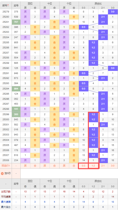 上期质合比:2:1,近10期质合比出现情况:1:2、1:2、2:1、1:2、1:2、1:2、1:2、2:1、1:2、2:1,最近10期出现3期2:1,出现7期1:2,出现10期0:3,出现0期3:0,根据近10期规律本期推荐遗漏隔期出1:2,防遗漏14期出0:3,综上所述质合比推荐:防:0:3,重点关注:1:2。