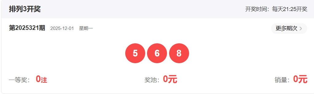 排列三第2025321期开奖回顾:开奖号码:568 形态:组六