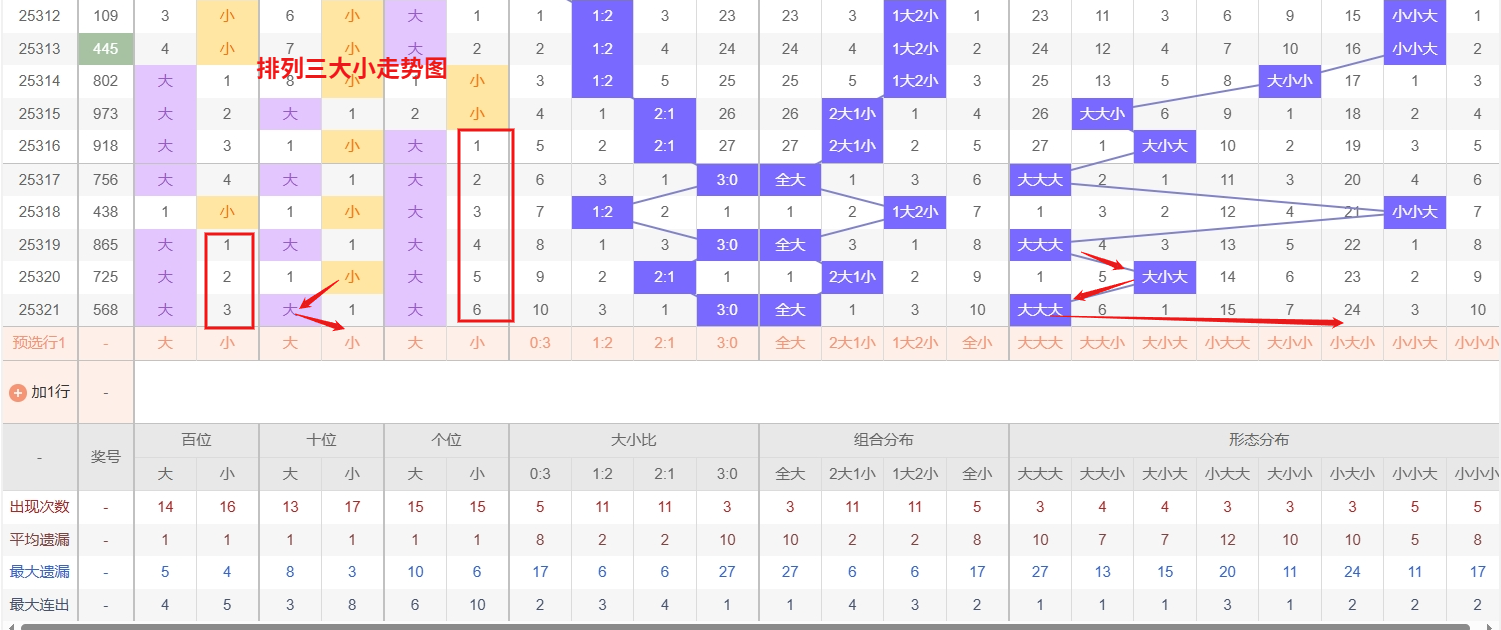 排列三 大小形态分析:从大小走势图上可以看出排列三100期内百位大小比约为51比49,十位大小比约为45:55,个位大小比约为54比46,除了个位和百位奇数比偶数多,十位是偶数比奇数多。历史数据近2期开出大大大下一期的走势为,第245期开出大大大第246期开小小小。第258期开出大大大后第259期开小大小,第263期开出大大大后264期开大大小。排列三大小走势中,近期“大大小”和“小小小”两种形态持续走热,形成了明显的热度聚集。从形态惯性来看,一旦某种组合确立热度,往往不会立即中断,短期内仍有连开或交替出现的可能,需要重点防范。尤其是“小小小”作为极限偏态,其连续表现常伴随号码组选的热度迁移,而“大大小”的稳定性也值得关注。综合判断,在接下来几期内,这两种热态形态极有可能延续强势,在关注其连下的同时,也要留意是否会出现如“大小小”或“小大小”等过渡形态作为热度转换的信号,所以排列三第2025322期大小形态推荐大大小防小小小。本文由一起彩钱是生命动力所著,请勿转载