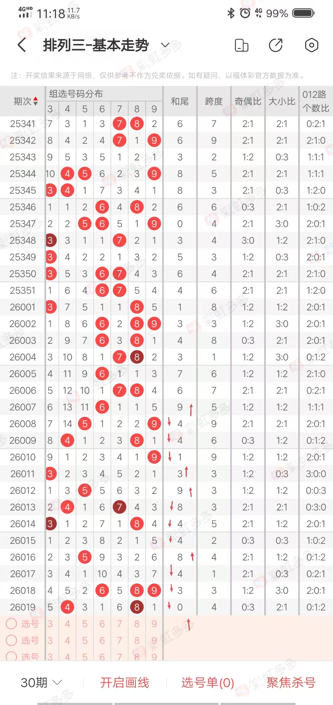 从走势图可以看出,近期幅度-9➕9-16➕9-7➕5➕0-3-8➕6➕9-4-10➕4-4➕19-3,上下幅度16左右,近15期多走上下走势,上期小幅度下降,本期有继续下降走势,综合和值在9-19之间,