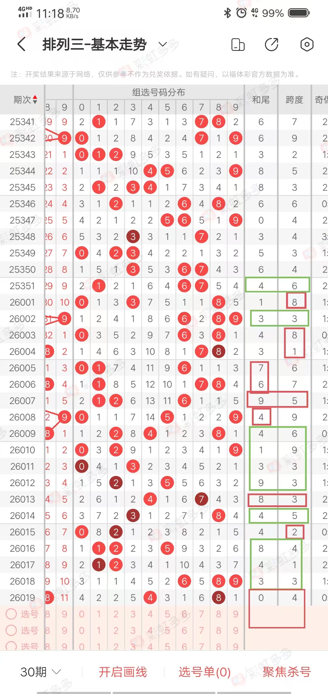 从近30期走势图,我们可以看出,上期和值尾和上期跨度,有很大概率不会出现在本期开奖号码,我们可以参考为杀号,上期和尾出现的概率是30期出10期,出号走势为11,01,01,000001111,00001,01,000,目前遗漏3期,有出号概率,上期和尾0,本期可以当作预防,4号是上期跨度,跨度出现下期的概率是8/30,出号走势为01,00001,01,001,011,001,000001,0000,目前遗漏4期,有出号概率,本期可以当作预防,两个号同时出现极少,近30期同时出现3次,作为条件04可以选择0-1个出号,