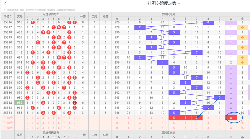 通过观察跨度及跨度属性走势可以发现:近10期内跨度较少开出01等号码,本期跨度大概率仍然不会开出01等号码,因此本期跨度选号时可以优先排除01等号码,再结合上述走势图看,本期跨度看好567等号码。