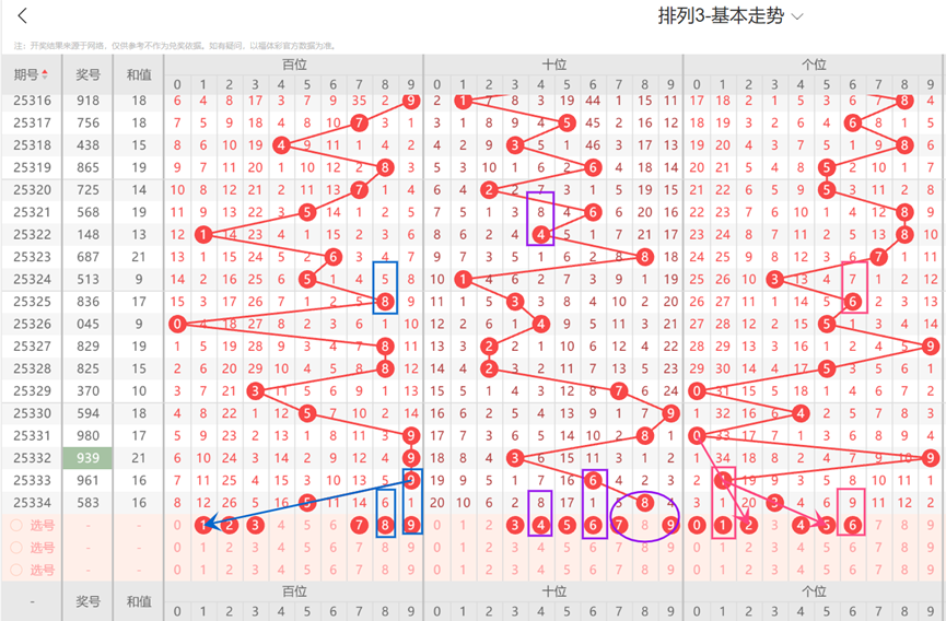 上一期个位开出号码3,为奇数、小数、质数,0路号码。近10期内个位较少开出89等号码,本期个位大概率仍然不会开出89等号码,因此本期个位选号时可以优先排除89等号码,结合上述走势图,本期个位看好012456等号码。
