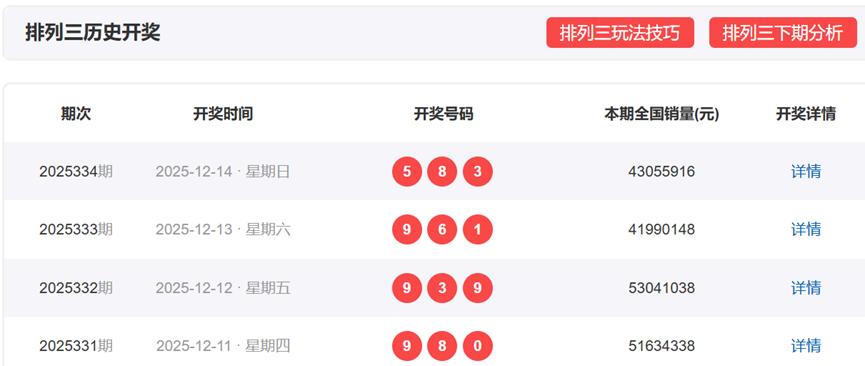 体彩排列3上一期,开奖号码为583,形态为组六,奇偶比为2:1,012路数值表现为220,和值16,和尾6,跨度5。
