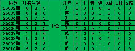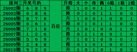 排列三是从0-9每期开出3个号码,截至2026010期三个位置最大遗漏的是23期的:个位的4号。