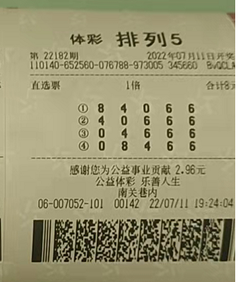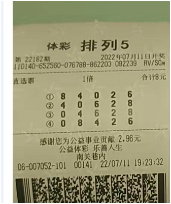 2022182期排5开奖号码是40662,全偶数的组合,这个全偶数组合我已经追踪多日,所以我的票面全是偶数组合,大家先看看彩票吧,不管中不中,都要亮出来,看看是多么的可惜。