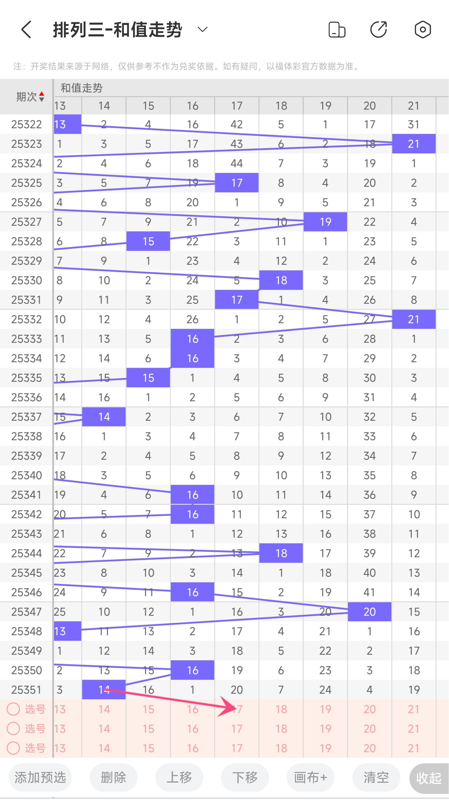 上期和值为14,往前一期和值为16,趋势往左移动,偏移量为2。通过走势图分析,14和值是近30期内开出中间偏小一点的和值,下降空间和上升空间差不多。本期看好和值变大,因此推测本期趋势是往右的,和值会变大,小概率往左,和值变小。