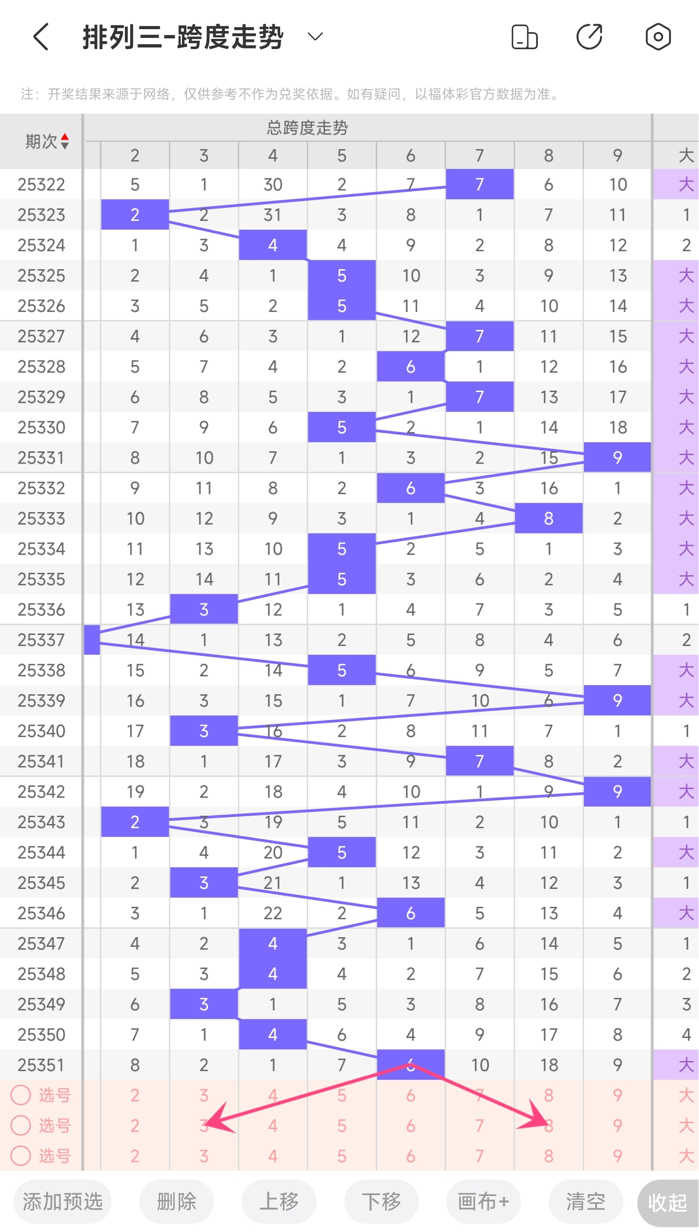 上期跨度为6,往前一期跨度是4,趋势往右移动,偏移量为2。跨度值6时,跨度值是近30期内开出中间位置的值。通过走势图分析,目前的趋势是可能往左也可能往右。所以推测本期跨度可能为23478等跨度。