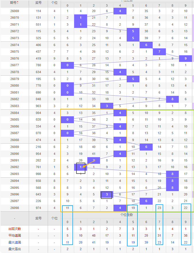 体彩排列3第2026099期的个位首先分析奇偶数号,如图所示近15期开出了2期奇数13期偶数,开出奇数概率比开出偶数概率要几乎小三倍,那么近十期都只开出过2期的奇数号,本期可以重点考虑开出奇数号。比如遗漏期数十期以上的5号、7号和9号,都达到了自身的最大遗漏期数可以防冷号开出。杀号建议定在偶数号。上一期的4号本期不考虑继续开出。可以考虑偶数,其次2路5号。