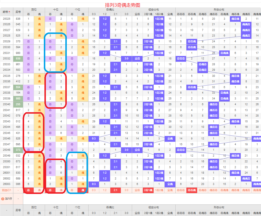 上一期的奇偶比为0:3,全偶的号码组合,从近五期的奇偶数出现情况看,奇数出6次,偶数出现9次,奇数号码出现较少,本期要侧重两奇的号码组合,侧重奇奇偶或偶奇偶的号码组合,根据奇偶组合形态可做五码定位13579/13579/02468或02468/13579/02468
