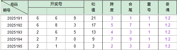 开奖回顾:体彩排3 第2025195期开出中奖号码为210,组合形态为组六、和值为3、合尾3、跨度2、重号2、奇偶比为1:2、百位2近30期出现6期,十位1近30期出现4期,个位0近30期出现2期。