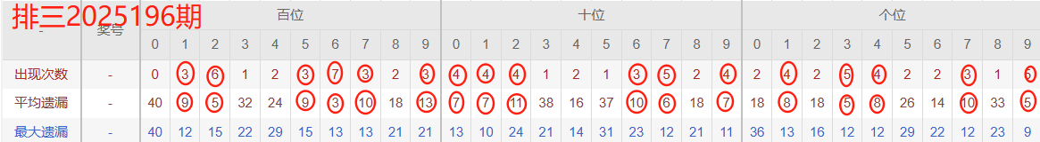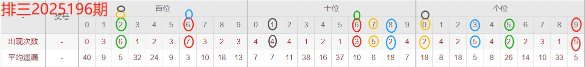 2025195期开奖号码210,我们可以看出近30期百位2出现6次,十位1出现4次,个位0出现2次。