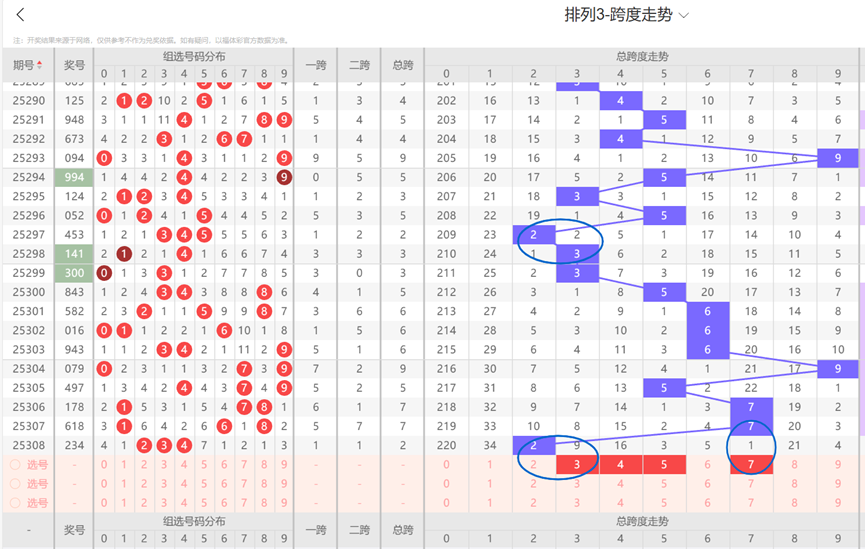 通过观察跨度及跨度属性走势可以发现:近10期内跨度出号主要集中在2到7之间,本期跨度大概率仍在此区间出号,即本期跨度看好2到7之间的号码,再结合上述走势图看,本期跨度看好3457等号码。
