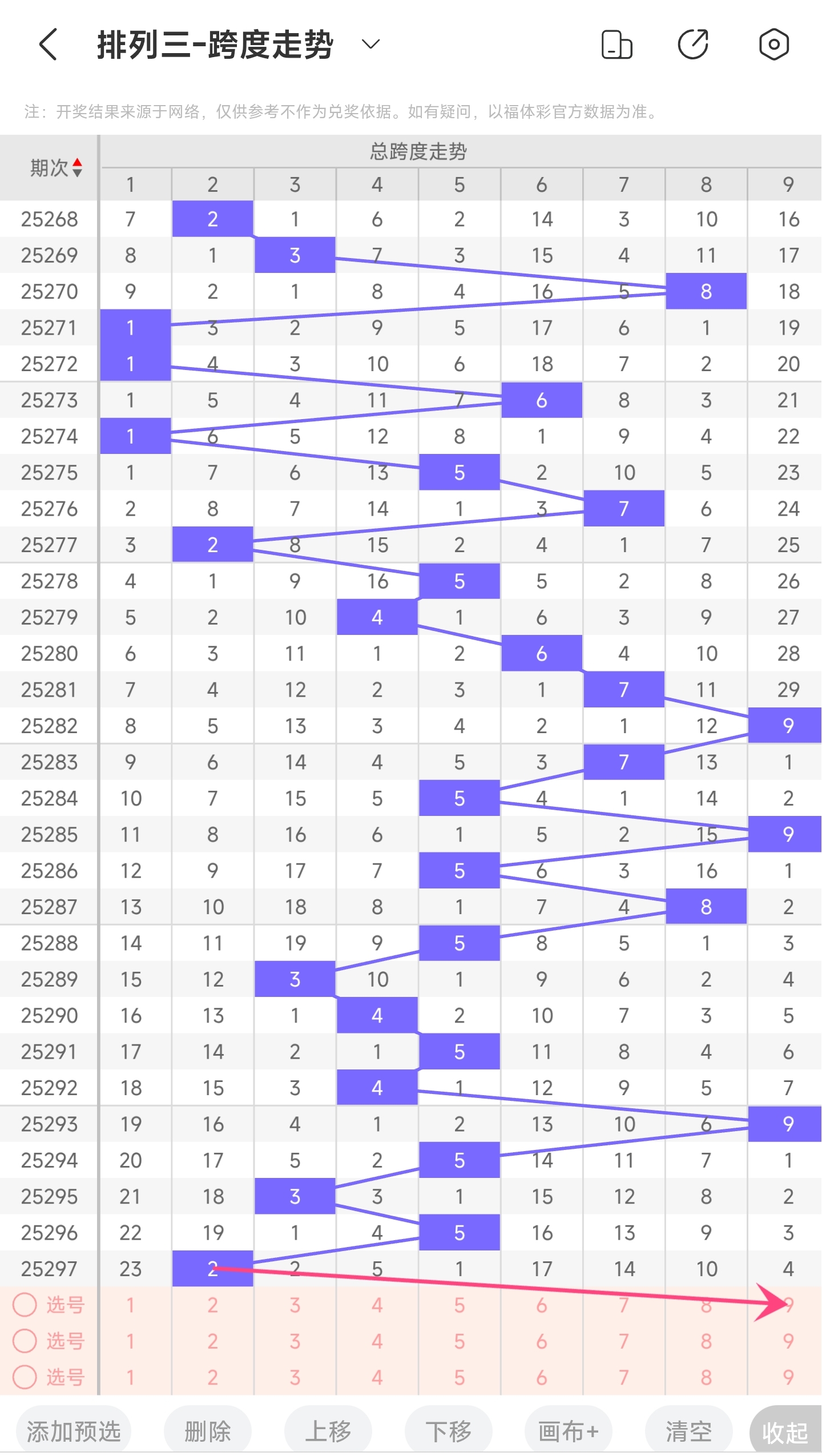 上期跨度为2,往前一期跨度是5,趋势是往左移动,偏移量为3。跨度值2时,跨度值是近30期内开出的比较小的值。通过走势图分析,目前的趋势是大概率往右。所以推测本期跨度可能为34578等跨度。